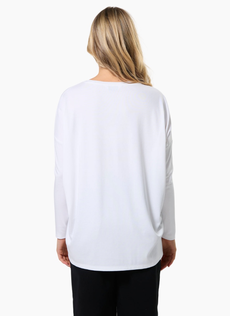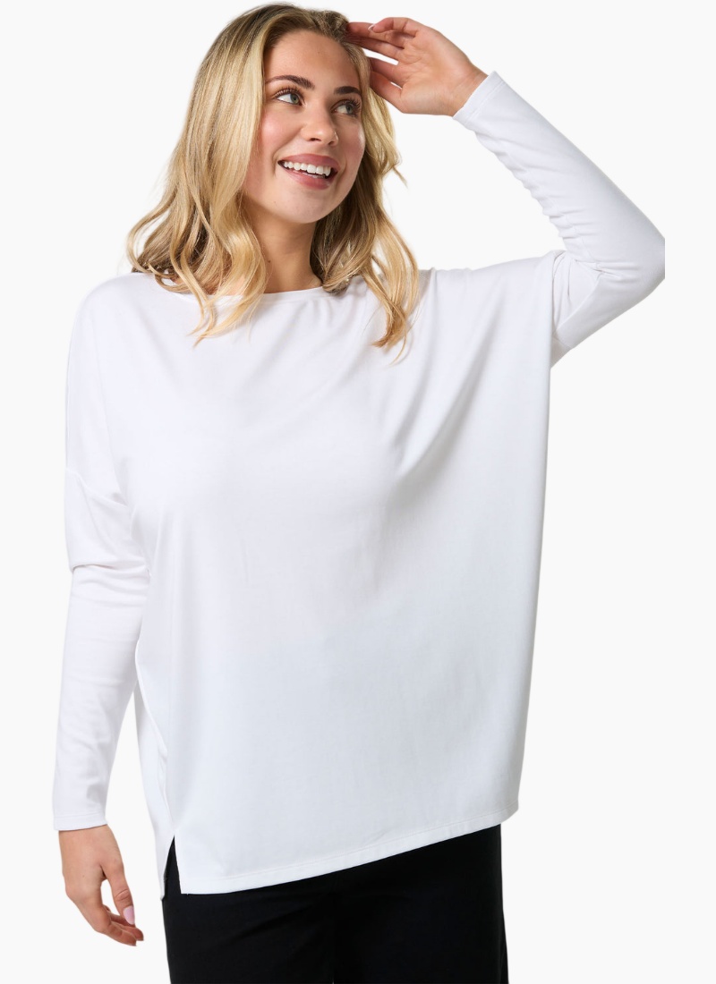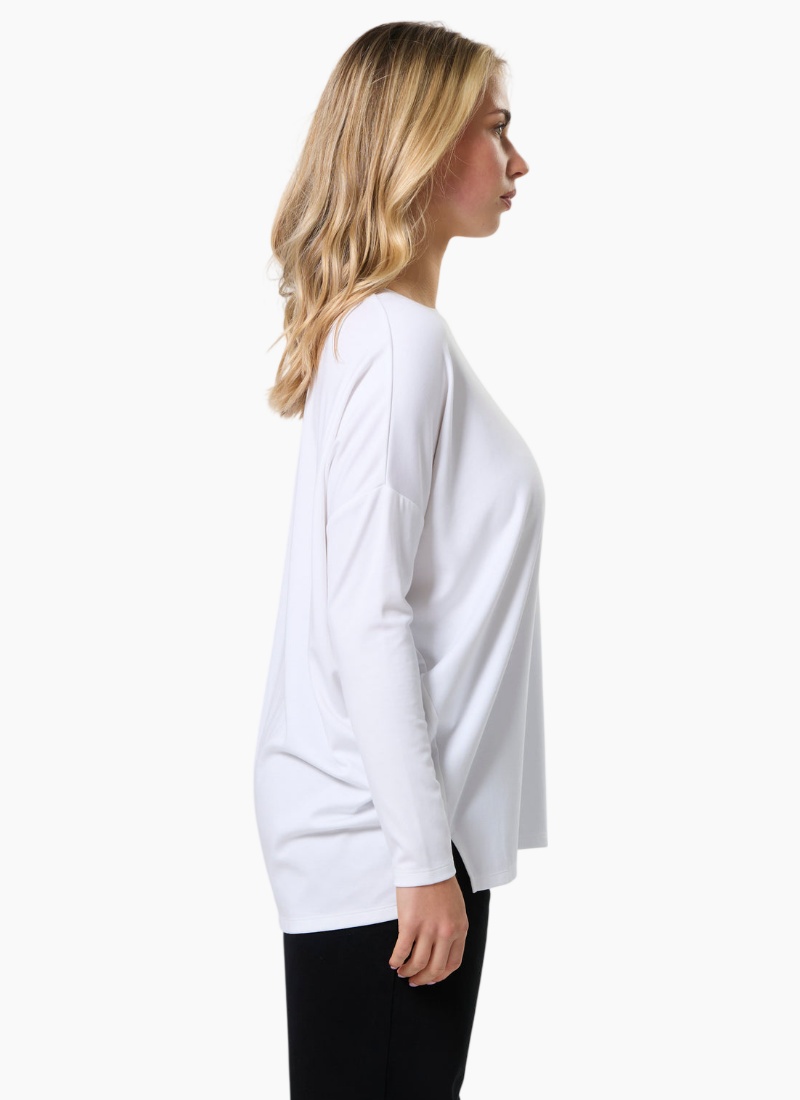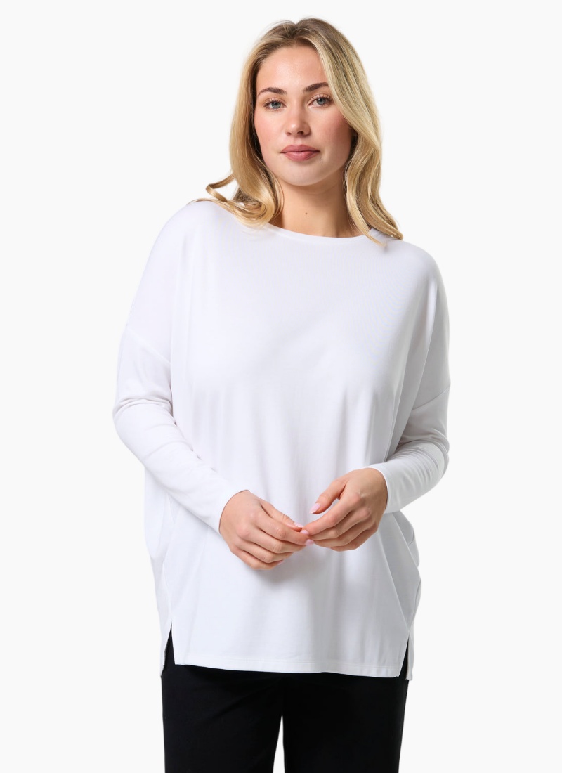 Relaxed fit jersey knit boatneck with dropped shoulder, fitted lower sleeve and side hem splits.47% MODAL / 41% POLY / 6% ELASTANE