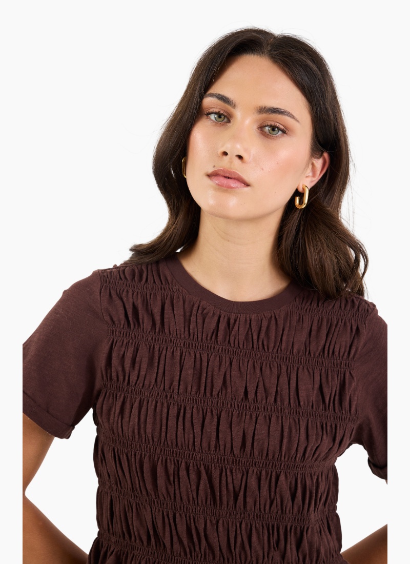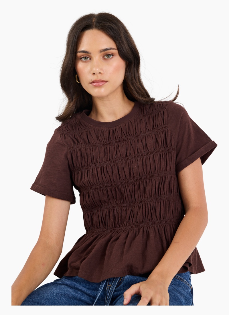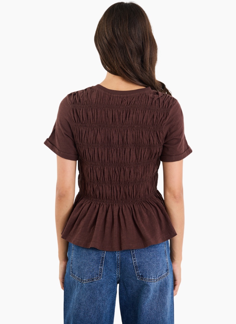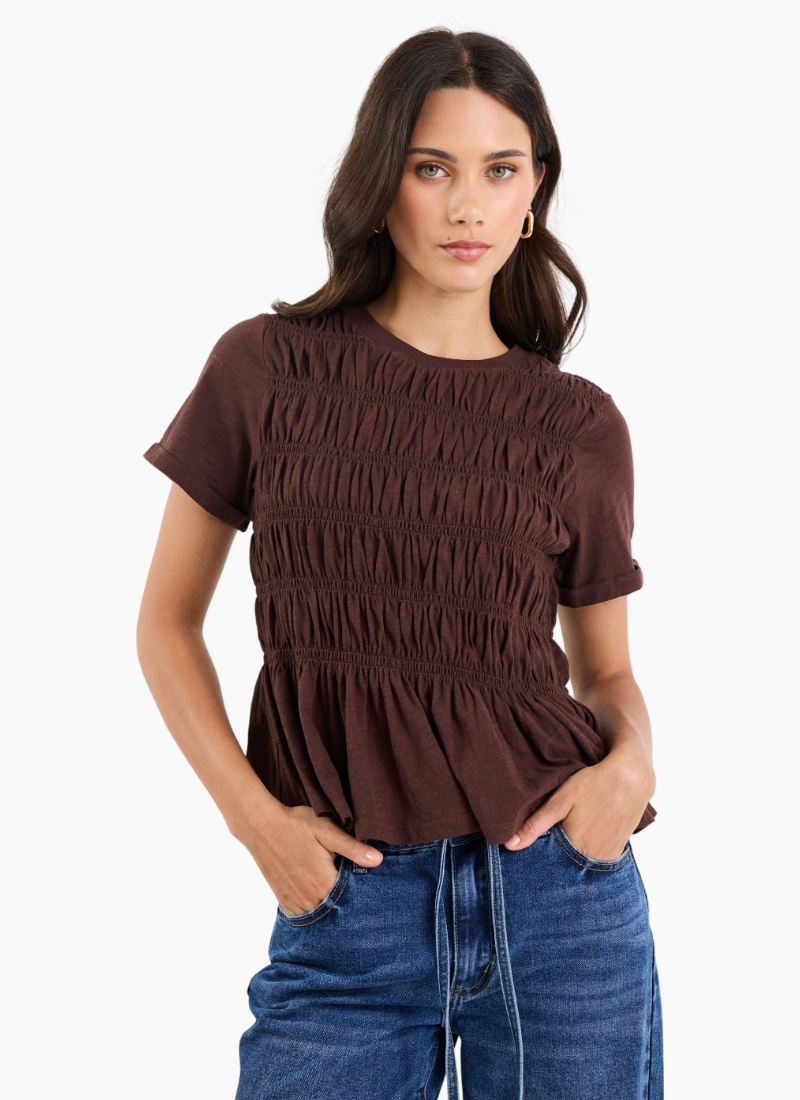 A casual tee with an elevated twist. This soft cotton top features all-over shirring that sculpts the silhouette and a gentle peplum hem for a flattering, feminine finish.