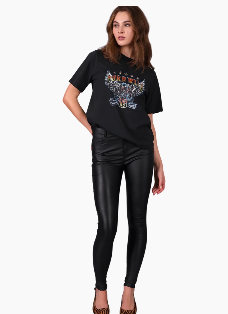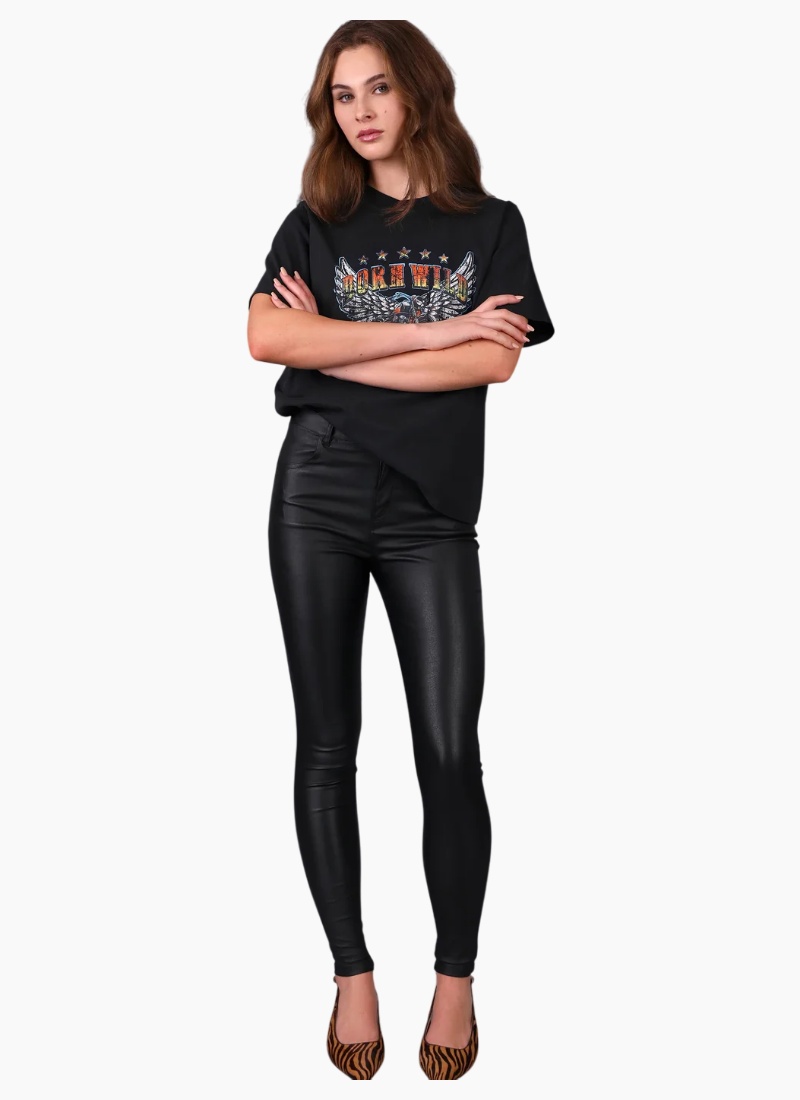 - Statement front graphic lends a rock-chic edge, ideal for dressing up with heels or down with sneakers