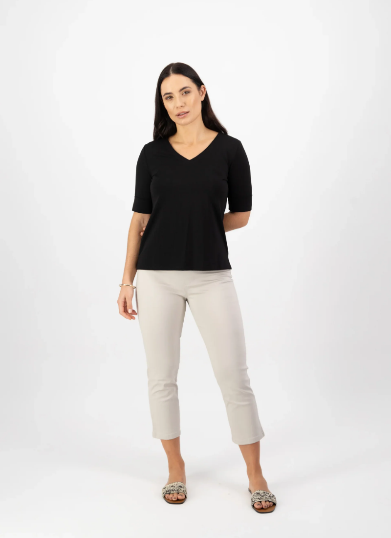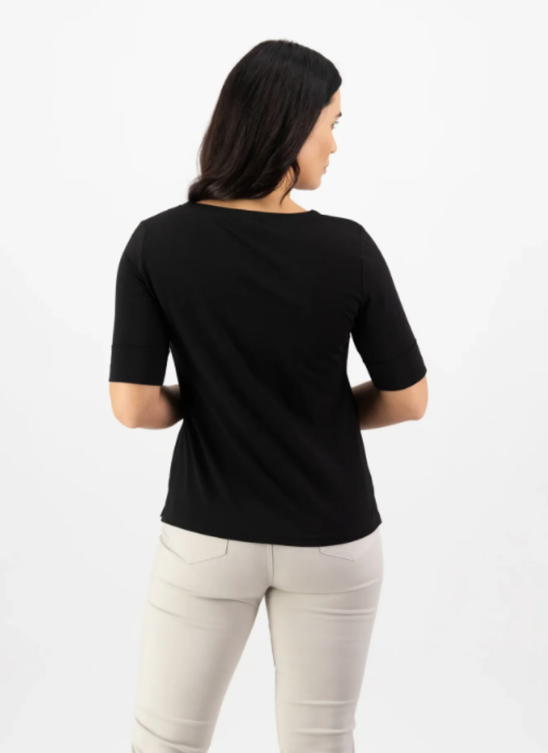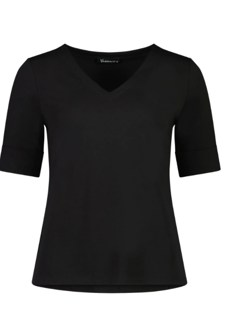 Introducing the 4264 V-neck Top from Vassalli. This timeless black V-neck offers effortless polish with everyday comfort.