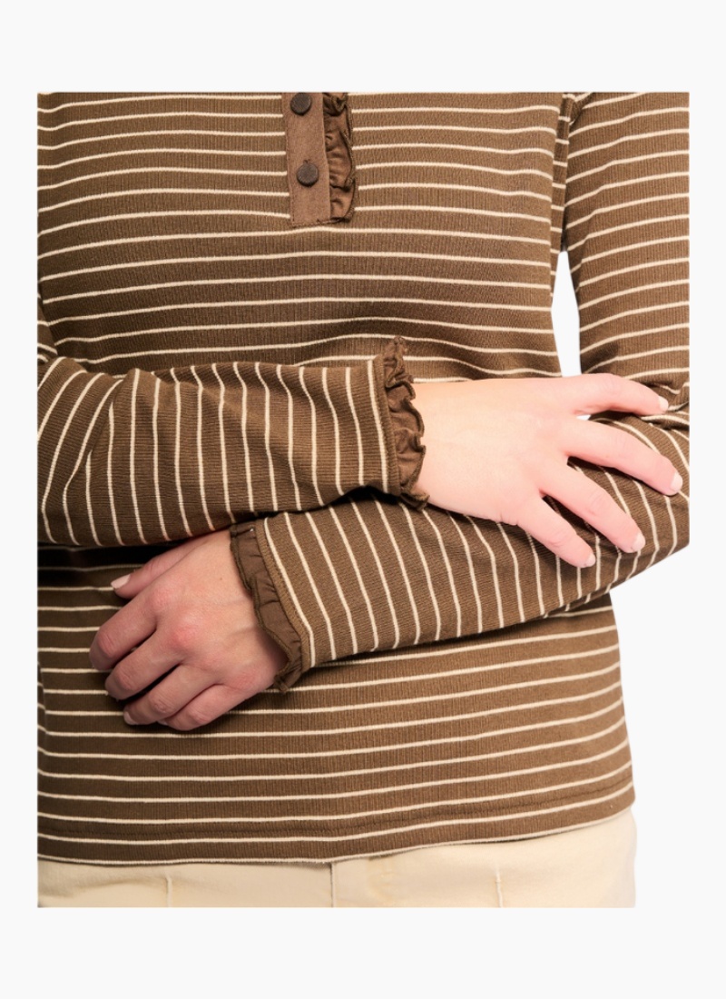 - Henley-style button placket and subtle ruffle trims at the cuffs add a feminine, crafted touch